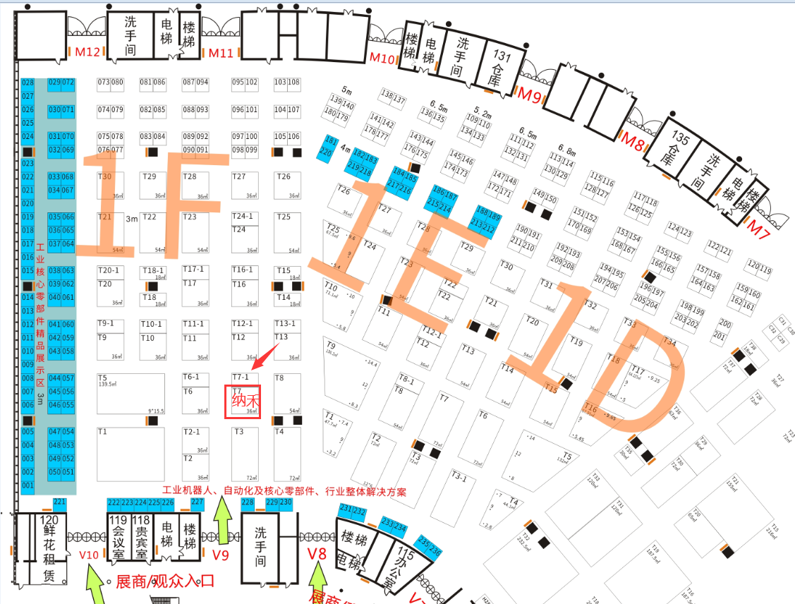 工業機器人及核心零部件展區F區T7展位,可(kě)由V8、V9門進入(rù)。