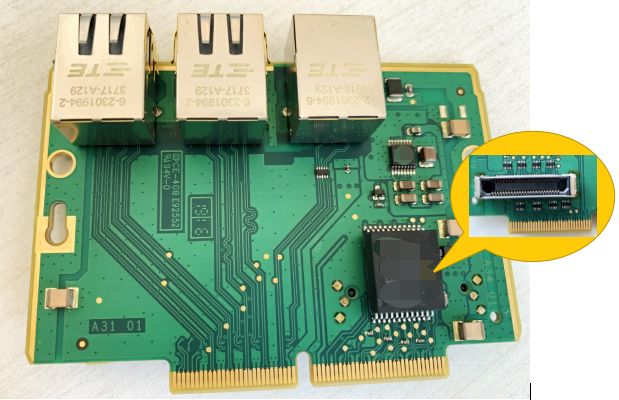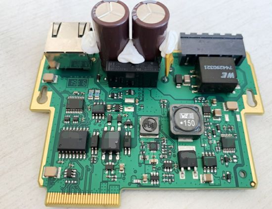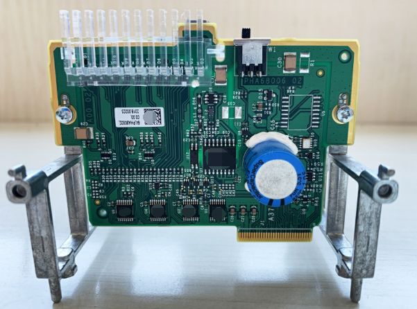 這是(shì)通信網絡的電路板,共有3個以太網口,其中最右邊的(de)同時支持Sercos實時運動控製總線。在右小角還有(yǒu)一(yī)個黑(hēi)色的PULSE公司HX5008千兆工業級網絡(luò)濾波器,在其背麵是一(yī)個千兆網絡擴展口。