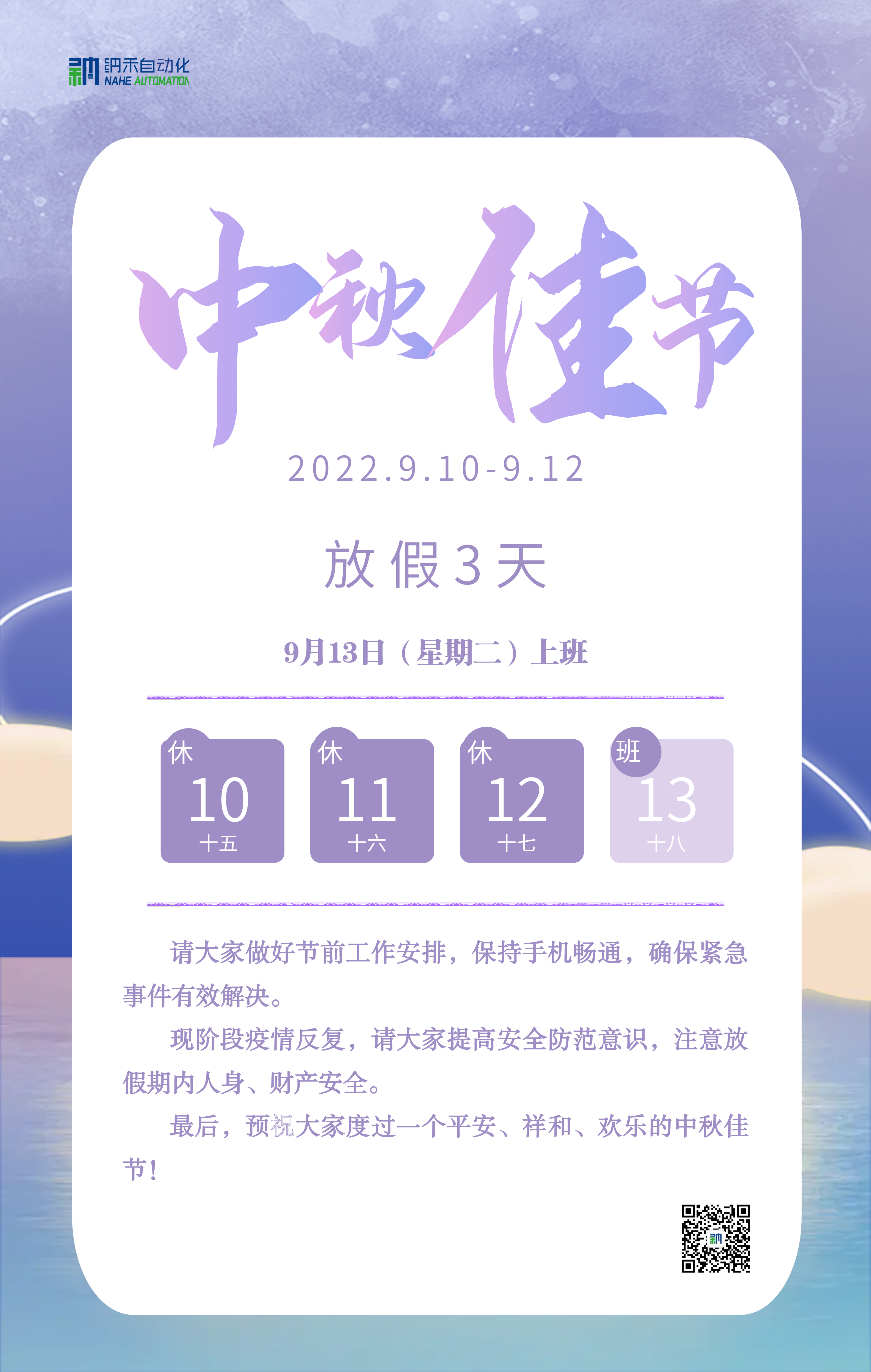 值此(cǐ)佳節來臨之際,全體同仁為您送上我們最(zuì)真誠的祝福:願您(nín)中秋快樂,幸福安康!