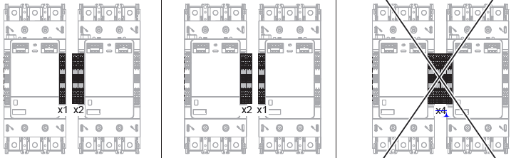 LC1G 接觸器最多可以安裝 4 個輔助觸點模塊,即最多可以實現 8 個(gè)觸點。接觸器左右 側各可以安裝 2 個模塊(自帶的(de) 1NO+1NC 模(mó)塊已安裝於右側)。如果 2 個接觸器采用機 械互(hù)鎖,那麽在兩(liǎng)個接觸器之間最多可以安裝 3 個輔助觸點模塊(如下圖(tú))。