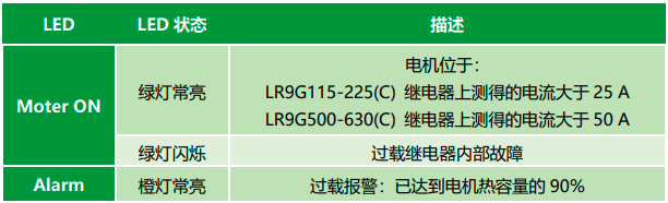 LR9G 熱過載繼電器上有(yǒu) 2 個 LED 燈,分別是 Alarm 警(jǐng)告指示燈和 Moter ON 電機通 電指示燈,請指示情況如下: